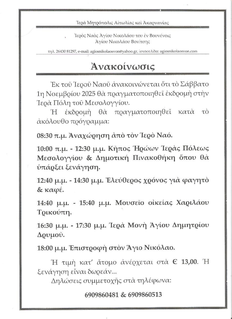 Ἐκ τοῦ Ἱεροῦ Ναοῦ ἀνακοινώνεται ὅτι τὸ Σάββατο 1η Νοεμβρίου 2025 θὰ πραγματοποιηθεῖ ἐκδρομὴ στὴν Ἱερὰ Πόλη τοῦ Μεσολογγίου.