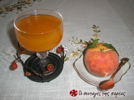 2) Σέ μία κατσαρολίτσα βάζουμε τά ροδάκινα, τή ζάχαρη καί τόν χυμό πορτοκαλιοῦ.
